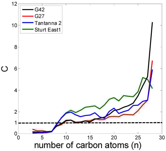 The numerical solutions of Equation (14) subject to boundary condition (12) are presented in Figure 7. For n > 10 the higher the carbon numbers, the higher the filtration coefficient. This corresponds to larger molecular weight and higher electrostatic attraction to the rock [54]. Also, long chains of molecule with high carbon numbers are easily strained between grains. However, for light and intermediate hydrocarbon n < 10 the trend is in the opposite direction, where the higher the carbon number the lower the filtration coefficient, which is explained by evaporation of a large component into a gas phase. The lighter components evaporate more intensively, which causes a decrease of their concentration in the oleic phase and effectively decreases the filtration coefficient as calculated by Equation (14).
