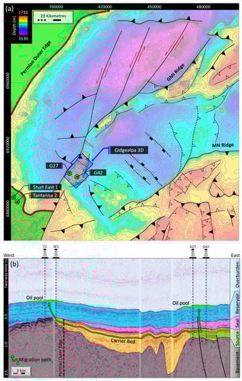 Structural interpretation of the Cooper-Eromanga Basin showing the location of wells, the Permian outer edge (where Triassic seal pinches out), and the migration of oil from source rocks to traps: (a)—Basement fault map of the study area showing the location of the four wells used in this study. Source rock composition was obtained from the Patchawarra Formation in wells G27 and G45. The expelled oil migrated along two pathways, vertically through large basement faults and laterally through a carrier bed. The oil compositions in the Jurassic reservoir are obtained from G27 and G45 wells (vertical migration through faults), and Tantanna 2 (T1) and Sturt East 1 (SE1) (lateral migration through carrier bed). [24,49]; (b) showing the two migration paths from the source rock in the Gidgealpa region to the oil pools through faults and via sedimentary rocks. The Permian outer edge shows the location where Triassic seals pinch-out, allowing oil to freely migrate from the source rock to the overlying reservoir rock.