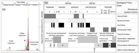 Summary of the Cooper-Eromanga Petroleum System Events: (a)—The timing of hydrocarbon generation and expulsion through time showing that initial expulsion commenced in the Late Permian and continues today [50]; (b) A summary of the key petroleum system events in the Cooper-Eromanga Petroleum System [30].
