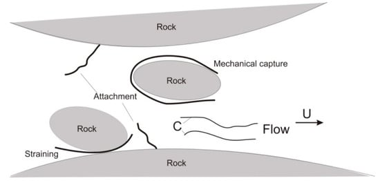 In this section we consider physics for size exclusion of large oleic molecule. During flow in natural and artificial rocks, fine particles are captured by the skeleton [36,37,38,39]. The schematic for deep bed filtration is presented in Figure 5. The figure shows particle retention by straining, attachment and mechanical entrapment. For straining and size exclusion, we consider the jamming ratio, which is the ratio between the particle size rs and pore size rp