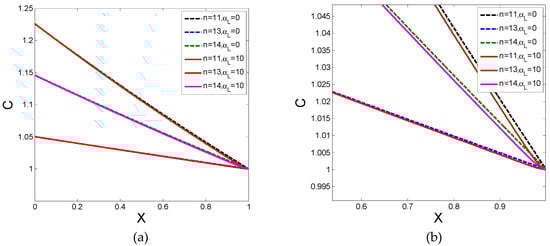 The profiles of concentration are shown in Figure 6 for n = 11, 13, 14. The difference between profiles with and without diffusion is negligible if compared with the values of concentrations.