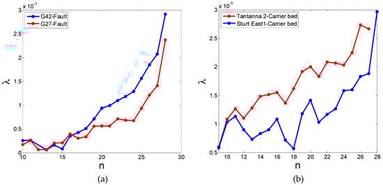 Filtration coefficients for hydrocarbons with difference carbon numbers for four different flow paths: (a) for wells G42 and G27, (b) for wells T2 and SE1.