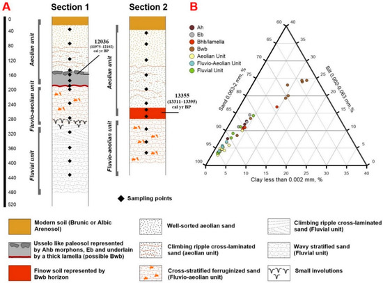 The buried soils of the aeolian coversands and inland dune fields of the Northern Hemisphere are considered important stratigraphic boundaries that played a significant role for the timing of aeolian activity through the Late Pleistocene and Holocene. Two paleopedological marker horizons are distinguished for the late glacial fluvio-aeolian successions of Central and Eastern Europe. The first one is the Usselo soil (or Usselo horizon), described over a wide area of the Netherlands, northern Belgium, Denmark, northwestern Germany, and central Poland [19]. The horizons of the Usselo soil are characterized by low organic-matter content, the presence of charcoals, and the predominance of bleached quartz grains. Usselo soil, as a rule, has a thickness of 5–20 cm and corresponds to the Ahb and Eb horizons of an initial podzol or Albic Arenosol that was formed in good drainage conditions. The average age of Usselo-type soils varies from the Allerød to the Younger Dryas [20]. The second type, Finow soil, was first discovered near the city of Eberswalde-Finow 50 km northeast from Berlin [21,22]. The soil consists of a 5–30 cm thick brownish horizon that contains charcoals. The widespread distribution of this type of paleosol was later established for the regions of western [23] and northern Poland [19]. The origin of the Finow soil is still debatable. According to some points of view, this layer is the sediment associated with the impact hypothesis [24], but not the Bwb horizon corresponding to a Brunic Arenosol. Based on the results of OSL and radiocarbon dating, development of Finow soils occurred during approximately the same period as the Usselo soil. In contrast to Central Europe, the findings and detailed descriptions of paleosols within the fluvio-aeolian successions of the European part of Russia are rather rare [6,12].