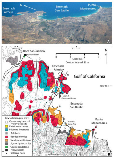 - Skinner, L.A.; Umhoefer, P.J. Submarine volcanism in the north Loreto subbasin, Baja California Sur, Mexico. In Volcanology, Geochemistry, Petrology, Proceedings of the AGU Fall Meeting, San Francisco, CA, USA, 5–9 December 2005; American Geophysical Union: Washington, DC, USA, 2005; V43B-1587. [Google Scholar]