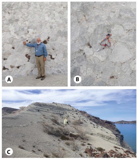 Exposures of rhyolite in the steep side walls of Ensenada Almeja (Figure 2B) rise 40 m above sea level. The extreme plasticity of banded rhyolite is illustrated by a deep fold with a downward-dipping axis ≥ 4 m preserved in a shallow sea cave on the east side of Ensenada Almeja (Figure 7A). Limestone caps the rhyolite massif along a north-south ridgeline that runs 0.5 km inland to the north from the Spanish Contessa’s house. The limestone features a basal conglomerate eroded from the underlying rhyolite. Rhyolite cobbles and boulders from 20 to 50 cm in diameter are encased in a limestone matrix (Figure 7B) that includes external molds of the large bivalve Periglypta multicostata preserved in growth position nestled among rhyolite clasts (Figure 7C). Typically, such a scenario suggests a former rocky shore and the life habit of this extant species is reviewed in the following discussion section. Below the same north-south ridgeline to the east, limestone outliers formed by abundant pecten shells sit on rhyolite as isolated deposits (Figure 2B).