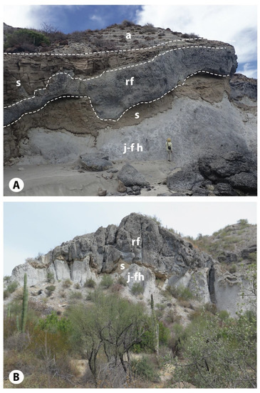 Stratigraphic successions at Rancho Santa Ana: (A) Coastal outcrop with person for scale, showing jigsaw-fitted hyaloclastite (j-fh) at the base, followed by siltstone (s), in turn baked and deformed by banded rhyolite flow (rf), overlain by more siltstone, and capped disconformably by hydromagmatic tuffs (a), (B) Similar sequence with cordon cacti for scale at the Santa Ana corral, showing a lesser amount of siltstone (S) squeezed between underlying hyaloclastite (j-fh) and overlying rhyolite flow (rf).