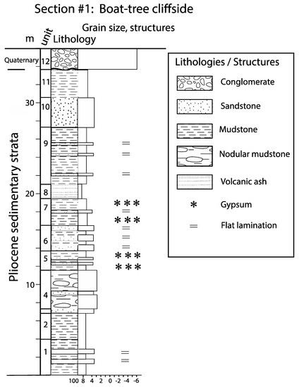 Stratigraphic succession dominated by interbedded mudstone and sandstone exposed at the Boat-tree cliffside (26°22′18.33″ N; 111°25′48.29″ W). Note: Variations in sediment size are indicated by the phi scale (8 to −6).