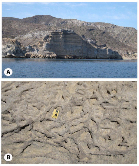 Eastward nearly as far as Punta Mencenares (Figure 2B), stretches of sandstone–siltstone bluffs rise between 40 and 50 m above sea level (Figure 6A). Bedding planes exposed near the base of the sequence exhibit extensive networks of horizontal burrows belonging to the trace fossil Thalassinoides sp. (Figure 6B). The sandstone–siltstone succession at this locality is capped by flat-lying limestone beds that thicken southward in excess of 20 m. The Pliocene echinoid Clypeaster bowersi recovered from the base of these limestone beds is an index fossil [10], the relative age significance of which is reviewed in the following discussion section. Limestone strata on the west side of the San Basilio basin (Figure 2B) also are underlain by silty sandstone bearing extensive horizontal burrows of the trace fossil Thalassinoides sp.