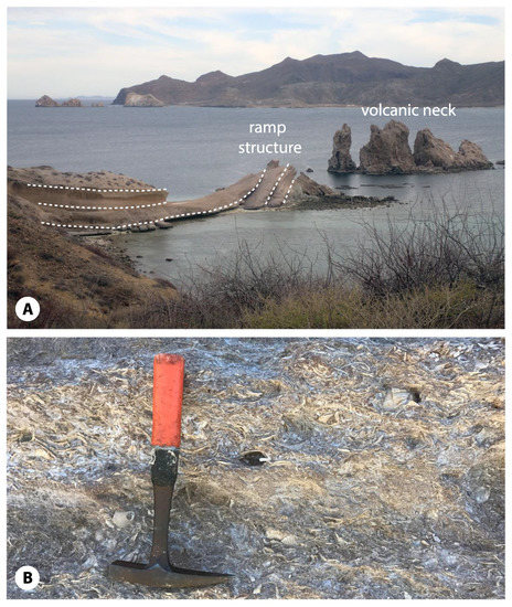 - Johnson, M.E.; Backus, D.H.; Ledesma-Vázquez, J. Offset of Pliocene ramp facies at El Mangle by El Coloradito Fault, Baja California Sur: Implications for transtensional tectonics. In Tectonic Evolution of Northwestern México and the Southwestern USA, 1st ed.; Johnson, S.E., Scott, R., Paterson, S.R., John, M., Fletcher, J.M., Girty, G.H., Kimbrough, D.L., Martín-Barajas, A., Eds.; Geological Society of America: Boulder, CA, USA, 2003; Volume 374, pp. 407–420. [Google Scholar] [CrossRef]