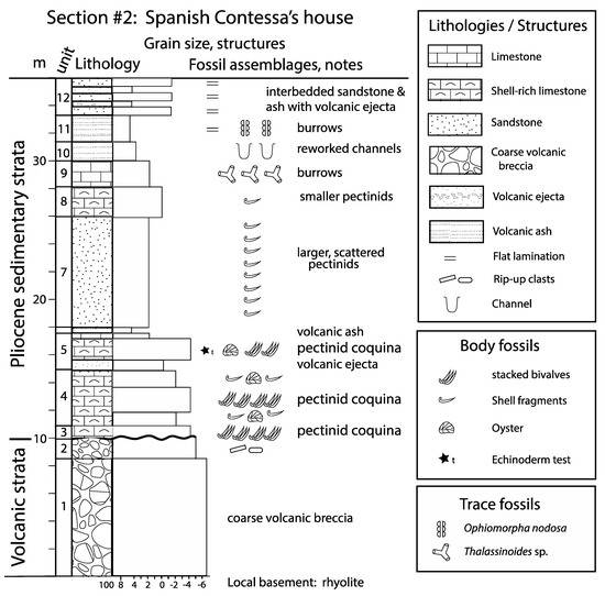 Strata in the lower part of the succession are dominated by shell coquinas. Northward dipping basal layers (Figure 8B) consist of disarticulated pecten shells and rare oysters densely packed with evidence of shell imbrication. Unusual examples of pecten shells incorporated within mud balls up to 20 cm in diameter are noted (Appendix A, Section 2, Unit 3). Below the coquinas, a thick volcanic breccia with sub-rounded blocks up to 1.5 m in diameter changes over to a volcanic agglomerate with rounded pebbles to small boulders of rhyolite up to 30 cm in diameter (Figure 9, units 1 and 2). Blocks of welded ash as much as 40 cm in cross-section are found in some upper limestone layers (Appendix A, Section 2, Unit 5). A marker bed formed by volcanic ash interrupts the sedimentary succession at a horizon 6.8 m above the base (Section 2, Unit 6). Layers of sandstone with scattered, small pecten shells follow above the marker bed with interbedded sands and volcanic ash becoming more prevalent, thereafter.
