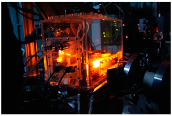 Countries working on concepts for a future generation of sustainable and more inherently safe nuclear fission reactors give special attention to the fate of long-lived minor actinide (MA, i.e., Np, Am, Cm) elements. As SNF reprocessing residues (i.e., after fabrication of (U,Pu)O2 mixed oxide fuels), MAs dominate the inventory of long-lived radionuclides, and thus suppression of their generation during reactor operation or conversion into mainly short-lived or stable isotopes after their extraction from SNF is considered to be beneficial. In France, the irradiation of U1−xAmxO2±δ compounds in a fast neutron reactor has been conceived as a reference process to study efficient MA burning, e.g., [12,13]. As the transmutation targets have to be present in the form of dense ceramic pellets, powder metallurgy processes with ball-milling steps have been found to be suitable, but generate large amounts of highly contaminant, sub-micron radioactive particles. Dust-free synthesis processes are thus preferable to establish a large-scale fabrication. A group from CEA Marcoule and CEA Cadarache, France, has investigated the formation of (U,Am) mixed oxide microspheres (as precursors for a later pelletizing step) obtained by wet impregnation of porous exchange resin microspheres. For the first time, the two-step high-T calcination process (i.e., (i) removal of the organic skeleton in synthetic air and (ii) formation of the final solid solution at a reduced atmosphere) has been investigated at INE-Beamline using-situ XAS measurements at the U L3- and Am L3-absorption edges at temperatures up to 1400 K [14]. The temperature of the sample was controlled using a specially designed micro-furnace. The sample holder—which is at the same time the heating element—consisted of a 1 mm diameter Pt/Ir wire with a 0.5 mm hole at its flattened center to hold the microsphere. The oven cell (acting as first containment, with all gas tubes sealed by high efficiency particulate air (HEPA) filters) was installed inside a Plexiglas box—representing the second containment—featuring X-ray transparent Kapton® windows for transmission and fluorescence signal detection and feedthroughs for gas tubes, cooling water lines, and electrical connections (Figure 1).
