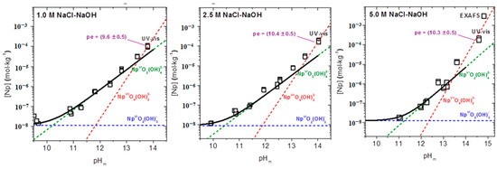 The agreement between experimental and calculated solubility data is satisfactory up to pHm ≈ 13, but model calculations significantly underestimate the experimental solubility above this pHm and with increasing hydroxide concentration. This observation strongly suggests the formation of additional aqueous species not considered in the original thermodynamic model reported in [42]. Considering the increased slope of the solubility curve in this pHm-region (slope ≈ +3), the newly formed aqueous species implies a larger Np: OH ratio than in the Np(VI) hydrolysis species described in [42], i.e., NpO2(OH)3− and NpO2(OH)42–.