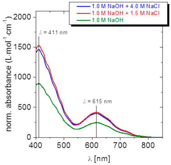 The characterization by UV-vis of the supernatant solutions equilibrated in 1.0 M NaOH, 1.0 M NaOH + 1.5 M NaCl and 1.0 M + 4.0 M NaCl provides additional insights on the Np aqueous species prevailing in hyperalkaline pHm systems (Figure 3). The supernatant solutions investigated are characterized by a bright green colour, with two absorption bands in the visible region with maxima at λ = 411 nm (ε = 1490 ± 30 L⋅mol−1⋅cm−1) and λ = 612 nm (ε = 380 ± 20 L⋅mol−1⋅cm−1) [42]. These bands can be assigned to the formation of Np(VII) aqueous species, as previously reported for Np solutions in the presence of strong oxidizing systems (XeO3, Na4XeO6, K2S2O8, KIO4, NaBiO3, KClO, KBrO and O3) [45,46].