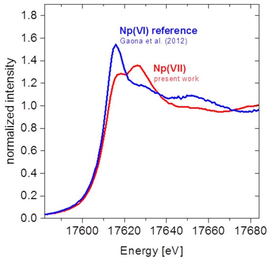 Neptunium is a light actinide with electronic configuration [Rn] 5f4 6d1 7s2. It is characterized by a very rich redox chemistry comprising the formation of aqueous complexes and solid compounds in oxidation states +III to +VII, besides Np metal. Neptunium is the heaviest actinide that can form stable compounds by losing all its valence electrons as Np(VII) (the formation of Pu(VIII) compounds remains so far putative, as recently discussed in Clark et al. [23]). The +VII oxidation state can be stabilized in strongly alkaline solutions under very oxidizing conditions [24,25,26]. The predominance of the tetraoxo core geometry NpO4(OH)23− in the aqueous phase was previously confirmed by spectroscopy (in particular XAFS) and quantum chemical methods, e.g., [27,28,29,30,31,32]. The same anionic moiety was reported for a number of Np(VII) solid phases, mostly forming in the presence of alkaline cations (Na+, K+, Rb+, Cs+), e.g., [33,34]. Understanding the aquatic chemistry of higher oxidation states of the actinides is a topic of fundamental interest for the actinide community, but has also some applied perspectives with regard to highly alkaline radioactive wastes existing in different legacy sites, cf. [35,36] and references therein.