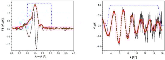 Experimental and theoretical k2-weighted Np L3-EXAFS spectra and their corresponding Fourier transforms are shown in Figure 5. Structural parameters resulting from the fit are summarized in Table 2, together with structural data reported in the literature for Np(VII) and Np(VI) aqueous species forming in hyperalkaline, oxidizing conditions. The fit of two oxygen shells with NO1 = 4 at R = 1.90 ± 0.005 Å and NO2 = 3.4 ± 0.9 at R = 2.32 ± 0.01 Å is sufficient to satisfactorily reproduce the experimental k2-weighted EXAFS spectrum and corresponding Fourier transform (R-factor = 0.006). These values are consistent with coordination numbers and distances reported for Np(VII) aqueous species by Bolvin et al. [28] and Ikeda-Ohno et al. [30], and significantly differ from the structural parameters reported for the Np(VI) species prevailing in hyperalkaline systems, NpO2(OH)42– (Nax ≈ 2 and Neq ≈ 4 at R = 1.80 and 2.23–2.25 Å, respectively [47,48]). They are widely acknowledged to correspond to the Np(VII) species NpO4(OH)23–, bearing in mind the large uncertainty associated with the coordination number N and its high correlation with the Debye-Waller factor σ2.