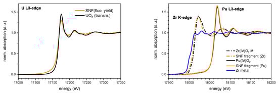 (left) U L3-XANES and (right) Zr K- and Pu L3-XANES obtained for the Gösgen fuel fragment (orange traces) together with oxide reference spectra (black traces) and Zr metal calibration spectrum (blue).