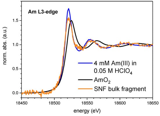 Finally, Figure 8 depicts the Am L3-edge XANES obtained for the SNF fragment, a solid Am(IV)O2 and an aqueous Am(III) reference sample ([Am] = 4 mM in 0.05 M HClO4)—the latter also measured in fluorescence detection mode (data from [16]). Comparing these XANES spectra, we can conclude that—in contrast to U and Pu, which are incorporated as tetravalent cations in the SNF matrix—Am retains its favoured trivalent oxidation state. Am isotopes are generated during fuel irradiation through β−-decay of 241Pu and consecutive neutron capture. Since recoil-induced Am-cation displacement in the UO2 lattice is not to be expected, the necessary charge balance might occur via formation of Am(III)O711− moieties with oxygen vacancies in the cubic, eight-fold coordinated cation site of the fluorite structure. Alternatively, UO2 can act as redox buffer:
