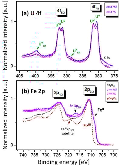The XP spectra for Um175 and Um175f in the region of the 4f binding energy are depicted in Figure 9a. The O 1s binding energy at 530.2 eV measured for the same sample was used to calibrate the energy positions of the U 4f peaks. Both spectra exhibit a splitting of the U 4f7/2,5/2 doublet. Fitting of the 4f7/2 peaks reveals two components, centered at 380.5 eV and 381.8 eV—characteristic of U(V) and U(VI), respectively [74]. The intensities of the U(V) main peak and the satellite structure obtained for sample Um175f (after addition of Fe(II) to the Um175 sample) are increased compared to the Um175 sample. The fit analysis reveals a contribution of ~45% and ~55% U(V) to the spectra of Um175 and Um175f, respectively. No main or satellite peaks characteristic for the presence of U(IV) are visible in any of the spectra, as expected at the relatively high Eh values of the batch experiments. Figure 9b depicts the corresponding XP spectra in the region of the Fe 2p binding energies. The amount of structural Fe(II) in the reacted magnetite samples is decreasing compared to stoichiometric magnetite as obvious from the decreasing Fe(II) contribution at ~708.0 eV.