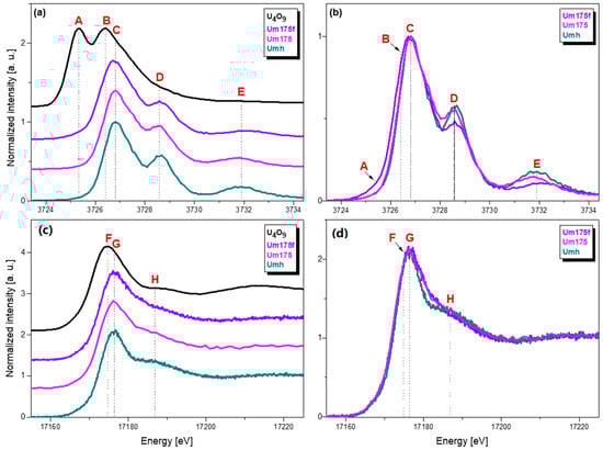 U M4 (a,b) and U L3 (c,d) edge HR-XANES spectra of U4O9 (black), Um175f (violet), Um175 (magenta) and Umh (marine).