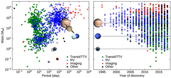 Since the discoveries of first exoplanets via radial velocity ([7], 51 Pegasi b), transiting method ([8,9], HD209458 b), and by direct/indirect imaging ([10,11], 2M1207 b/Fomalhaut b) (The “List of exoplanet firsts” can be found from https://en.wikipedia.org/wiki/List_of_exoplanet_firsts) almost 4000 planets have been detected (http://exoplanet.eu/) and more than 4000 candidates awaiting for validation [12]. The right panel of Figure 1 shows the masses (for planets detected by RV method only the minimum mass is available) of the so far discovered planets as a function of discovery time labeled according to detection technique. The data is extracted from Extrasolar Planets Encyclopaedia [13]. Thanks to the increasing number of ground based and space based planet search surveys, the number of exoplanets has increased significantly during the last years. The plot also shows that the detection of planets with masses as low as the one of Earth became possible.
