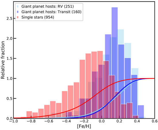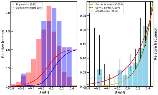 Detection of only four giant planets required from Gonzalez [107] noticing that these planets tend to appear around metal-rich stars. This hint was very soon confirmed using relatively larger samples, e.g., [108,119,120], and become a well established correlation, e.g., [86,121,122,123,124], known as giant planet–metallicity correlation.