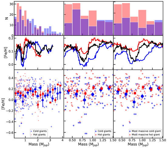 In the middle column of Figure 9, one can see that both hot- and cold-Jupiters show a dip in metallicity at about ∼0.8 M, although the dip of cold Jupiters is more apparent. The main reason of separating hot and cold Jupiters is that orbital periods of giant planets correlate with the host star metallicity: long-period Jovians tend to orbit more metal-poor stars than hot-Jupiters, e.g., [138,160,161,162]. This correlation can be seen in Figure 9 as well, where the red squares and red curve lie above the blue circles and the blue curve. To make the description of planets inside and outside of the metallicity dip easier and shorter, the planets inside the dip will be called ‘sub-Jupiters’, and the planets with masses higher and lower than the sub-Jupiters will be called ‘Jupiters’ and ‘Saturns’, respectively.