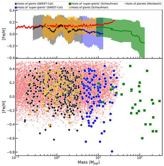 Exoplanets are sometimes categorized into different populations defined by distinct metallicity distributions, e.g., [136]. Ribas and Miralda-Escudé [192] found that the average metallicity of stars with planets of mass < 4 M is lower than that of higher mass planet hosts by about 0.15 dex. However, in their comparison, the authors did not separate the super-Earth and Neptune mass planets from giant planets. Moreover, these low mass planets in their sample mostly had super-solar metallicities, while the majority of later-on detected low-mass planets hosts have subsolar or solar metallicities, e.g., [159,193], if not orbiting their stars at very short periods [161,194]. Using a significantly larger sample of giant planets with masses greater than 0.1 M and with homogeneously derived host metallicities derived in SWEET-Cat, Adibekyan et al. [161] revisited the metallicity distribution of very massive giants. The authors found that the stars hosting massive Jupiters (mass > 4 M) have an average metallicity of 0.083 ± 0.032 dex, while the stars hosting planets with masses between 1 and 4 M had an average metallicity of 0.149 ± 0.016 dex. Despite the lower average metallicity (lower by 0.066 ± 0.036 dex) of massive Jupiter hosts when compared to the relatively lower mass Jupiter (1 < M< 4 M) hosts, the performed KS statistics suggested a probability of about 15% that the two subsamples have the same underlying metallicity distribution. Adibekyan et al. [161] concluded that a simple separation in mass at 4 M does not reveal two different populations in metallicity.