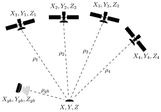 Geometry of Global Navigation Satellite Systems (GNSS) single point positioning with additional ground-based augmentation.