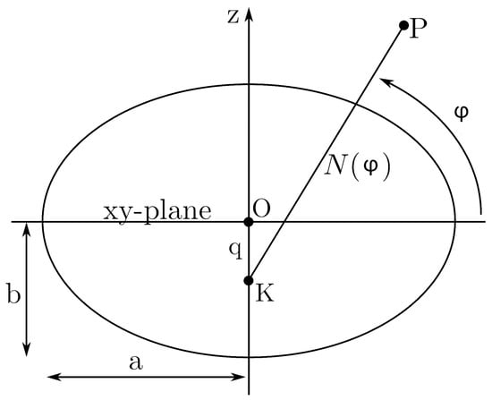 1. Calculation of geodetic satellite coordinates (latitude φ, longitude λ, height h), and distance q from the center of the ellipsoid to the intersection of the normal to the ellipsoid at the receiver position (Figure 2) [12].
