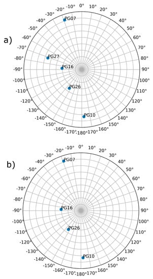 For the case study, we placed the receiver on a street between two buildings at the University of Warmia and Mazury in Olsztyn, Poland. Satellite locations were calculated on the basis of precise orbits from 20 May 2016 at 18:00. The location of the receiver and obstacles in the vicinity caused the receiver to track only five satellites, depicted in the bottom panel of Figure 3. To perform tests in even worse conditions, satellite PG27 was removed from the constellation (Figure 3a).