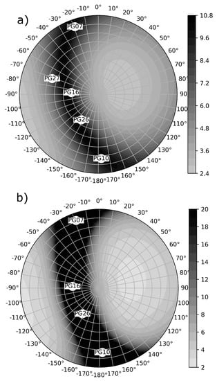 Heatmaps of PDOP calculated for a four-degree grid of transceiver locations at the observation point. Bottom panel (b): PDOP values with all visible satellites; top panel (a): PDOP values with Satellite 27 removed. Gray tones depict the PDOP value. In the top panel, the heatmap is limited to 20 for readability.