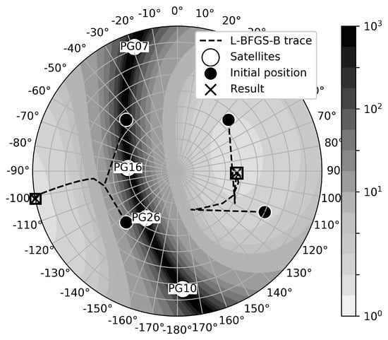 In order to calculate solution of this function, one of the numerical methods can be used. As described in [14], the mathematical minimum of such function results with satellites distributed uniformly around the receiver. This means that an additional transmitter would have to be located with the elevation lower than 0. This is the reason why the selected method should allow one to define constraints on the parameters (El, Az). The L-BFGS-B method [15,16] for optimal position estimation was chosen for this problem. This is a modification of the limited-memory BFGS optimization algorithm. It belongs to the family of quasi Newton methods and approximates the Broyden–Fletcher–Goldfarb–Shanno algorithm. The modification allows one to handle bound constraints on variables. In our case, the parameters are constrained as follows: