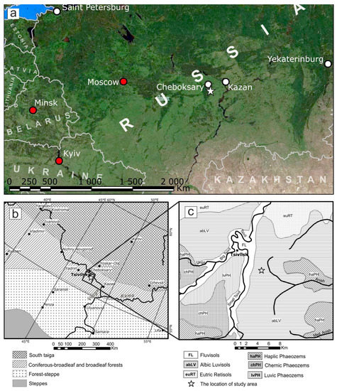 Location maps of the study area. (a) Regional-scale map; (b) Vegetation zones of the central part of the Russian Plain (modified after [21]); (c) Soil contours in the vicinity of Tsivilsk according to the State Soil Map of the Soviet Union 1:1,000,000 [22]. Reference Soil Groups according to IUSS Working Group WRB [23].