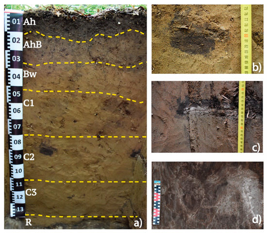 The buried soil was identified as Folic Eutric Cambisol Protocalcic. The following sequence of the horizons was distinguished: Ahb-AhBb-Bwb-BCb-Cb-Ckb-R (Figure 4a, Table 1). The whole soil profile is weakly structured. The upper Ahb horizon has a very dark color—black to very dark brown, 7.5 YR 2.5/1-2, which is darker than the humus horizon of the surface soil, although the thicknesses of these horizons are almost equal. The transitional horizon AhBb displays a sandy clay loam texture, the presence of humus mottles and weak horizontal lamination, derived from the original layering observed in the sedimentary hard rock. The underlying Bwb horizon has a similar sandy clay loam texture and also shows weak signs of horizontal structuring. This horizon contains very fine fragments of lithogenic material (calcareous and non-calcareous) and shows traces of past mesofauna activity. Below the Bwb, the soil stratum consists of unstructured sandy loam. The BCb horizon has a yellowish-brown color, grading into the Cb horizon which contains fine soft Mn nodules, further underlain by a slightly reduced loamy sand Ckb horizon with numerous altered calcareous coarse sandstone fragments (Figure 4b–d) and finely divided lithogenic material which causes a slight effervescence of the soil matrix.