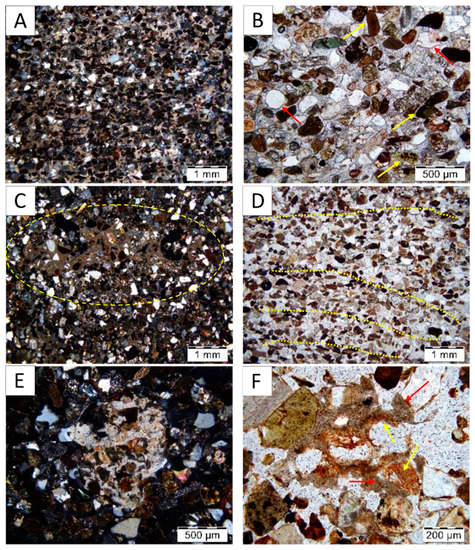 Microfeatures of the groundmass in the surface soil (A–C) and in the buried soil (D–F). (A,B) Microphotographs of the C3 horizon of the surface soil at depth 125–130 cm: calcareous well-cemented sandstone slab, NX (A); mineral composition of the sandstone slab, NII (B). Please note: the non-opaque sand-grains (marked by yellow arrows), thin coatings on the mineral grains (marked by red arrows). (C) Microphotograph of the C2 horizon of the surface soil at depth 95 cm: fragments of weathered calcareous sandstone slab, incorporated in the non-calcareous groundmass; NX. (D,E) Microphotographs of the Ckb horizon of the buried soil at depth 110–115 cm: composition of the parent material with the tendency of sand grains to lamination NII (D), weathered primary carbonates; NX (E,F) Microphotograph of the Cb horizon of the buried soil at depth 60–65 cm: secondary carbonate nodules (marked by red arrows). Please also note the residuals of modern roots in the inner part (marked by yellow arrows).