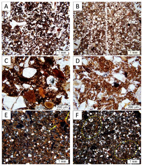 Microstructure and fine material features in the buried soil (left—A,C,E) and in the surface soil (right—B,D,F). (A,B) Microphotographs of the Ahb horizon (0–5 cm) of the buried soil with moderately separated granular microstructure (A) and the Ah horizon (3–8 cm) of the surface soil with weakly separated angular blocky microstructure (B); please note the difference in the color of the fine material; NII. (C,D) Microphotographs of the Ahb horizon (0–5 cm) of the buried soil with dark brown cluster-like fine material (C) and the Ah horizon (3–8 cm) of the surface soil (D) with brown fine material including small single dark particles and plant residues; NII. (E,F) Microphotographs of subsurface horizons. The Bwb horizon (20–25 cm) of the buried soil (E): fine material with high birefringence and poro-, granostriated b-fabric; please note thin clay coatings (marked by yellow arrows). The Bw horizon (30–35 cm) of the surface soil: scarce fine material and single spaced equal enaulic c/f related distribution; please note zones similar to the Bwb horizon groundmass (marked by dashed yellow ellipses); NX.