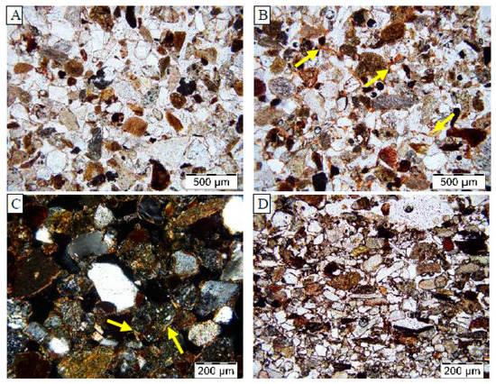 Pedofeatures of the C horizons in the surface soil. (A,B) Microphotographs of C2 horizon (110–115 cm). (A) the zone of coarse monic c/f-related distribution and (B) the zone of concave gefuric c/f-related distribution; note the red-brown colored links between the sand grains (marked by yellow arrows); NII. (C) Microphotograph of the C1 horizon (60–65 cm) with stagnic features, please note bleached clay coatings (marked by yellow arrows); NX. (D) Microphotograph of the R horizon (130–132 cm); note the enrichment in dark fine material in comparison to the microphotograph A; NII.