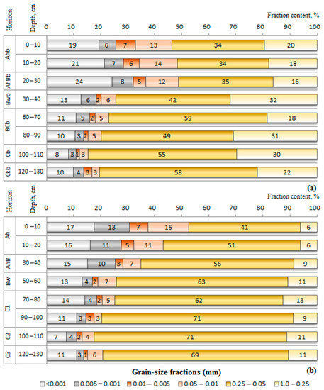 Particle size analysis was performed for the fine earth fraction <1 mm. The boundaries between six particle size classes were defined in accordance with the Russian conventional fraction groups [27]. The coarse and medium sand fraction (1–0.25 mm) and the fine sand fraction (0.25–0.05 mm) were separated by sieving while more fine-grained fractions of the coarse, medium and fine silt (0.05–0.01 mm; 0.01–0.005 mm; and 0.005–0.001 mm, respectively) as well as the clay fraction (<0.001 mm) were determined by the pipette method after sample pretreatment with sodium pyrophosphate. The data on textural fraction contents were used for the reconstruction of the particle size distributions [29,30] and textural classes were approximated according to the FAO Guidelines for soil description [25]. Calcium carbonate contents and рН in a water suspension (soil:water ratio = 1:2.5), exchangeable cations and exchangeable acidity were analyzed using conventional methods for soils of forest zone [27].