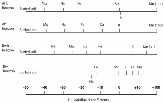 Other evidence of climatically humid conditions during the development of the paleosol are the elluvial/illuvial coefficients (EIC) calculated for the basic elements and Fe and their depth functions, confirming that both soils underwent leaching regimes. However, the leached zones are rather shallow and restricted only to the upper 40–50 cm. According to the EIC values, the Ah and Ahb horizons show a greater total loss of Mg, Na, Fe than the subsurface horizons. Due to biological cycling the surficial horizons also displayed a poor leaching of Ca and K and strong accumulation of Mn (Figure 9), the element which is strongly involved in biocycling by some arboreal species in subtaiga zone [53,54]. The Bw and Bwb horizons also show the leaching of bases, but reveal insignificant loss or even a slight accumulation of total Fe.