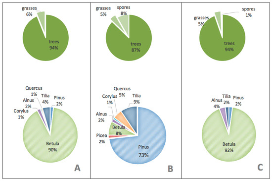 In the pollen spectra of the surface and the buried soils, arboreal pollen are dominant. In the surface soil, trees account for 94% of the total spectrum, while in the buried soil they vary between 87–94%. Pollen of birch is dominant in both soils, in the surface soil representing 90% and in the northern wall of the buried soil 92% (Figure 10). Pollen of broadleaf trees (oak, lime) and also Corylus, a typical shrub in broadleaf forests, are rare in both soils; however, in the present-day forest community they are dominant species. An admixture of conifers occurs in the pollen spectrum of both the surface and the buried soils (Figure 10). In the buried soil, pollen of pine (73%) and spruce (2%) were identified in the topsoil of the western wall, showing a reliable presence of coniferous trees in this location. In the northern wall only pine grains in minor quantities (2%) were found.