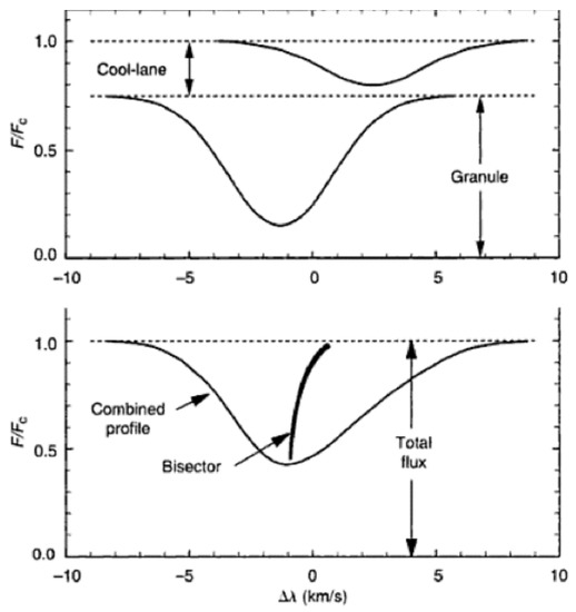 Schematic from [27] displaying the relative (top) and combined (bottom) contribution of the bright, blueshifted granules and the dark, redshifted intergranular lanes; note the lane profile has been artificially offset in flux for display purposes. The curvature in the line bisector displays the asymmetries in the combined profile.