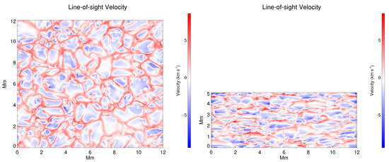 Line-of-sight RVs for a 3D MHD simulation snapshot at disc center (left) and = 0.5 (i.e., 60; subset of Figure 1 in [35]). Negative and positive velocities denote blueshifts and redshifts, respectively. © AAS. Reproduced with permission.