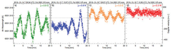 Center-to-limb solar observations of the Fe I 6302 line taken with the LARS spectrograph (Figure 4 from [44]), covering a region 10” wide; the scale on the right-hand side shows how the oscillations change in amplitude from near 200 m s at disc center, down to ∼50 m s near the limb.