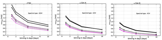 Subset of Figure 13 from [66] showing the residual rms after smoothing granulation noise over various amounts of observing time in a given night, with 1–5 different measurements per night (top; 1: smooth, 2: dotted, 3: dashed, 4: dot-dashed, 5: dot-dot-dot-dashed). Also shown is the impact of binning all observations in 1–10 consecutive nights, if the total observing time in a night were 26 min.