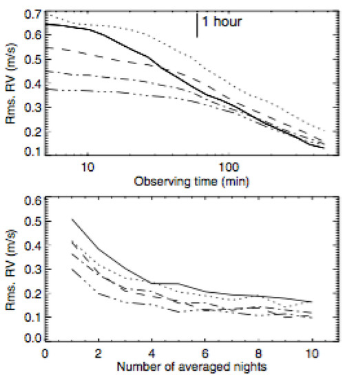 Using these model stars, Ref. [66] explored the impact of various observational strategies to maximize binning out the solar granulation and/or supergranulation RV variability. They varied the total observational time in a given night from ∼5 min up to just over 8 h, and tested the impact of spreading this time equally over a given 10 h night in intervals of 1–5 (e.g., an observing time of 2 h with 4 intervals would mean 30 min exposure times separated by 2 h each in a given night); in this way they examined the impact of numerous various exposure times. For each combination of observing time and number of observations per a night, the authors also tested the impact of binning together 1–10 consecutive nights.