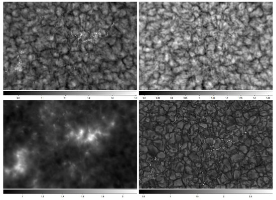 Time-averaged solar observations in the G-band (top left), blue continuum (4170; top right), and Ca II K (bottom left), with a physical size of ∼61” × 57” (∼44 × 42 Mm). A single G-band exposure is also shown (bottom right) for comparison, the physical size of the image is slighter larger at ∼67” × 65” (∼49 × 47 Mm). Each time-average image was averaged over a ∼1 h time frame and normalized to the time-dependent mean (intensity scale displayed at the bottom of each image). Observations were obtained from the ROSA instrument on the Dunn Solar Telescope in May 2009 [78]. The G-band and continuum observations have a cadence of 30.3 frames per second (0.033 s) and a cadence of 0.528 s after speckle-reconstructed (i.e., diffraction limited) images (of 15 ms exposures) were created; the time-average images were then created by averaging all 6079 individual reconstructed images together (over a total timespan of 53 min). The Ca II K observations have a cadence of 3.8 frames per second and a cadence of 4.224 s after speckle-reconstruction (of 200 ms exposures); the time-average image was created by averaging all 761 individual reconstructed images together (over the same 53 min observing time). Although the granular lifetime is 5–10 min, prominent underlying structure is clearly still evident, in both the G-band and continuum images, after averaging over a 1 h period. It is also interesting to note that the Ca II K image also still displays cellular structure from the presence of granulation, and that the regions associated with the magnetic bright points (visible in the G-band) display the most evident structure (though this may just be a byproduct of the fact that magnetic structures are bright in the Ca II K, and therefore easier to discern).