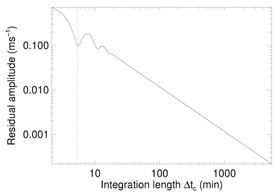 A subset of Figure 3 from [82], showing the residual RV amplitude of solar oscillations as a function of integration (i.e., exposure) time. A vertical dashed line shows the exposure length equal to 1/, where is the peak frequency in the envelope of solar p-modes (and therefore sensitive to the specific stellar parameters) © AAS. Reproduced with permission.