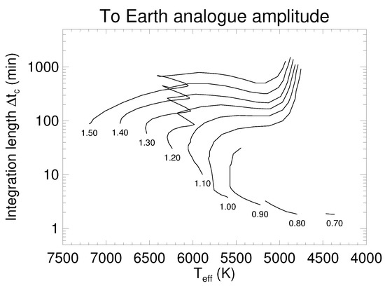 Based on a bootstraping technique, Ref. [57] calculated the false alarm probability (FAP) for a variety of detection limits [64,65]. They predicted that increasing the number of observations per night to 2 or 3 should push their detection limits down to planets ∼2–3 times as massive as the Earth. In particular, since the K dwarfs have naturally lower amplitudes in convection and oscillations, they argue that for these targets they may be able to detect habitable zones planets with a mass twice that of the Earths. However, it is not yet clear what is the true habitability and/or structure of planets in this mass regime. Moreover, it is apparent that the elusive Earth-analog would remain beyond the realm of realistic possibilities, at least in the 4 years of observational time considered here.