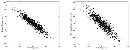 The (mean-subtracted) bisector curvature (left) and normalized brightness proxy (right) as a function of granulation-induced RV for the Fe I 6302 line from the model star simulations of [90]; the brightness was approximated by integrating the area under the line profile. A strong linear correlation is clearly discernible but would require the next generation of spectrographs and space-based photometric missions to be empirically observed.