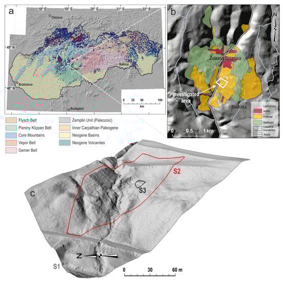 (a) Location of the study area: Map of main geological units of Slovakia with distribution of slope failures (modified after [,,]). Active and stable slope failures are depicted by red and blue colors, respectively. The location of the study area is shown by a white polygon. (b) Shaded relief map of the investigated area near Železna Breznica village. Landslides registered in national database (modified after []) and the position of the investigated area are shown. (c) Detailed view on the studied slope. S1, S2, and S3 polygons are related to the light detection and ranging (LiDAR), remotely piloted aircraft system (RPAS), and close-range photogrammetry (CRP) survey technologies, respectively.
